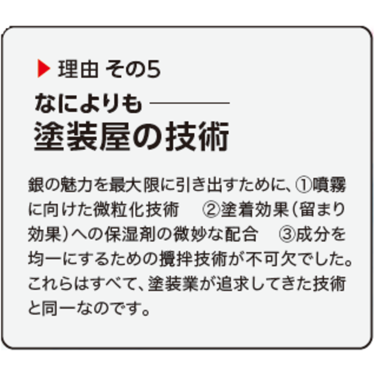 SIAAの定める3つの基準を満たした、確かな「抗菌性」「安全性」、そして塗装屋だからこそ生み出せた「微粒子化技術」「保湿剤の微妙な配合」「均一な撹拌」